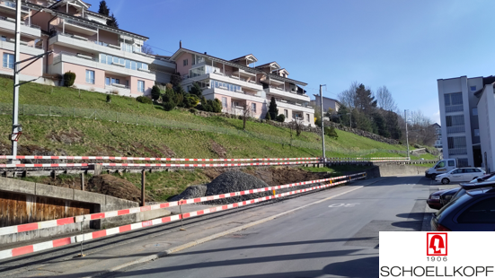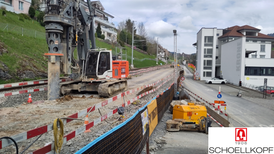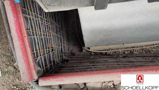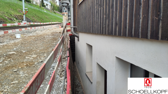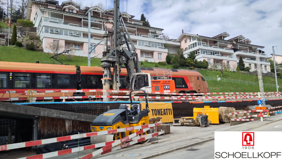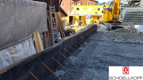 Das SCHOELLKOPF Steilböschungssystem Fortrac Systems wurde für die Erstellung des temporären Bohrplanums in ca. 2.0 m Höhe erfolgreich eingesetzt. Die Gegebenheiten auf der Baustelle waren extrem beengt, weshalb die bewehrte Erdkonstruktion ganz nah an das Gebäude geführt wurde. In den Nachteinsätzen konnte dann von dem Steilböschungssystem aus mit dem rund 50 Tonnen schweren Bohrgerät die Bohrpfähle parallel zum Gleis erstellt werden.