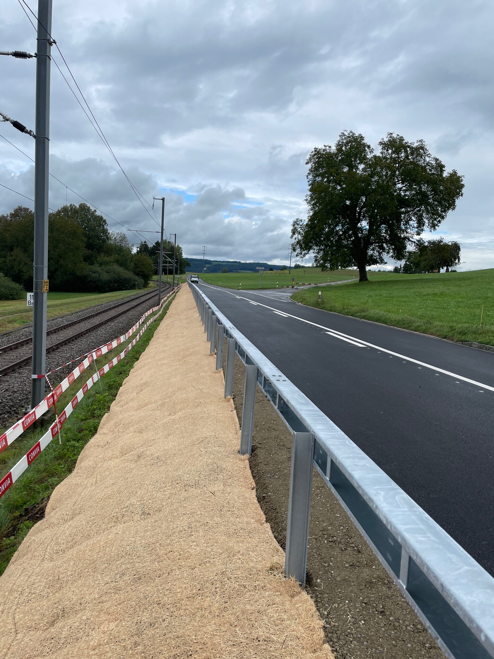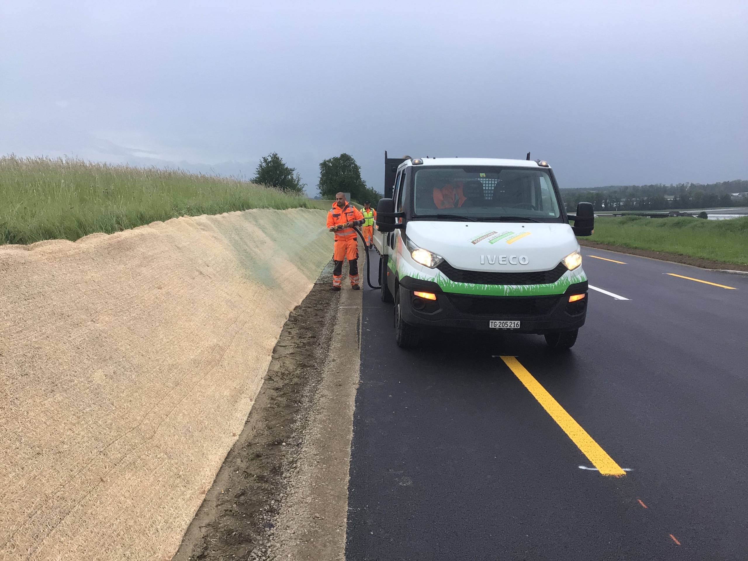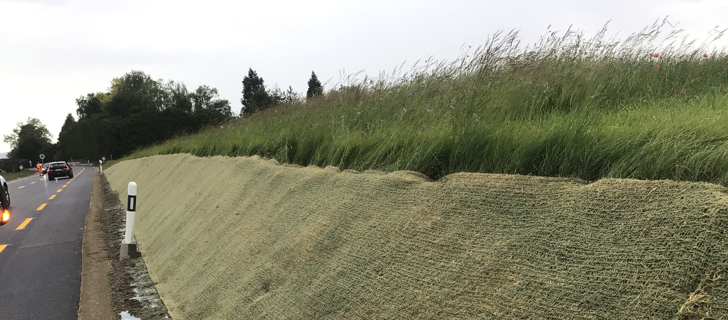 Viele Strassen-Sanierungsarbeiten werden in diesen Wochen abgeschlossen. Abschnitte über mehrere Kilometer werden mit regionalem Saatgut von IG Regiosaat wiederbegrünt. Teilweise wurden Böschungen neu angelegt, welche mittels in der Schweiz gefertigten und 100 % natürlichen Erosionsschutzmatten von Lindner Suisse stabilisiert werden. Insbesondere bei den diesjährigen Wetterbedingungen ist der Erosionsschutz von grosser Bedeutung. Die effiziente Ansaat per Hydrosaat ermöglicht die Begrünung an schwierig zugängliche Böschungen.