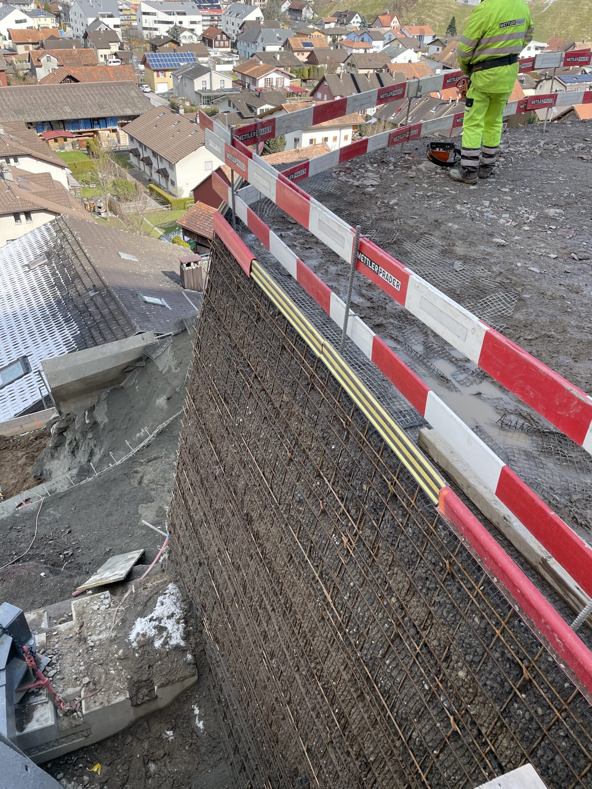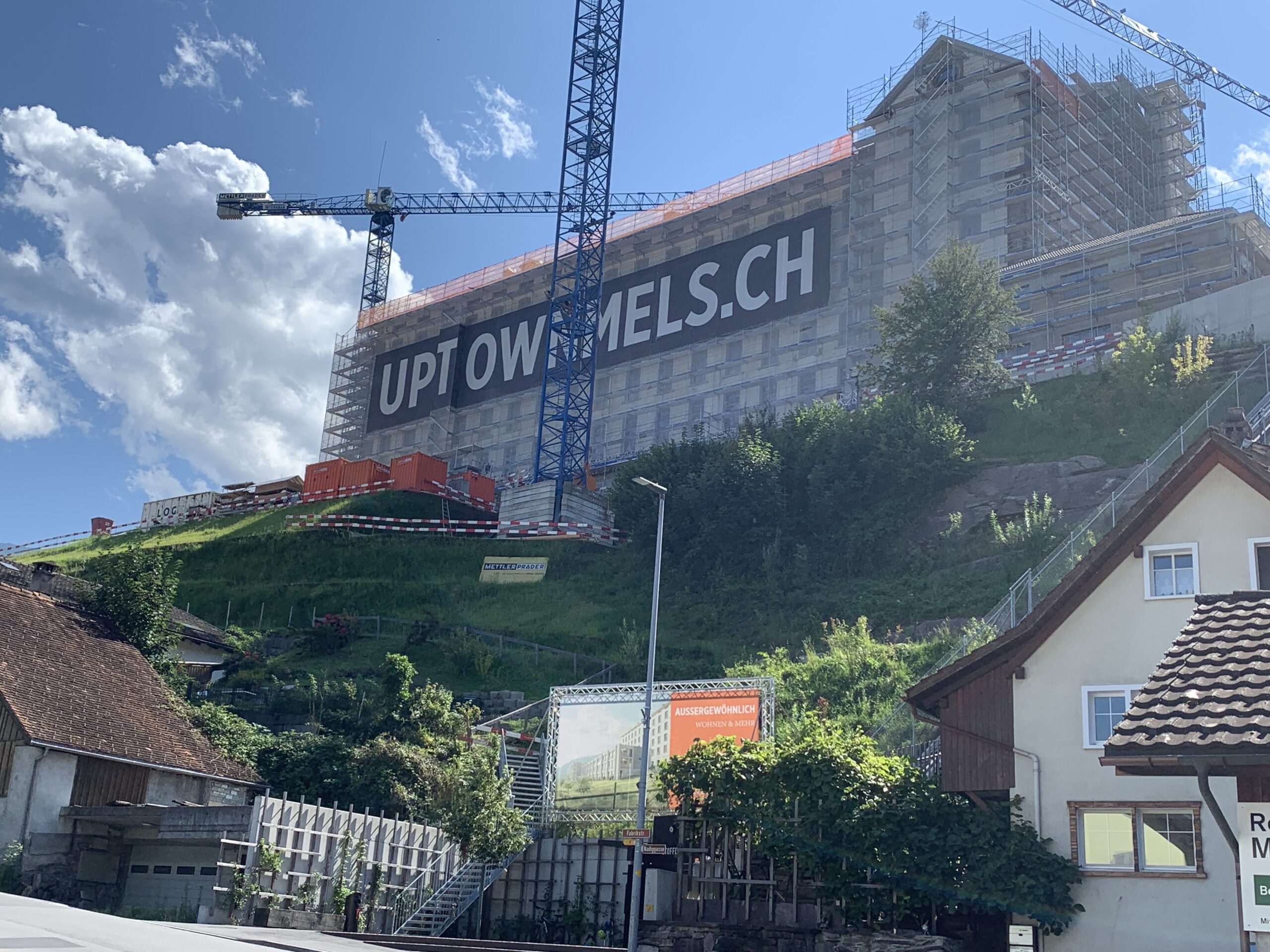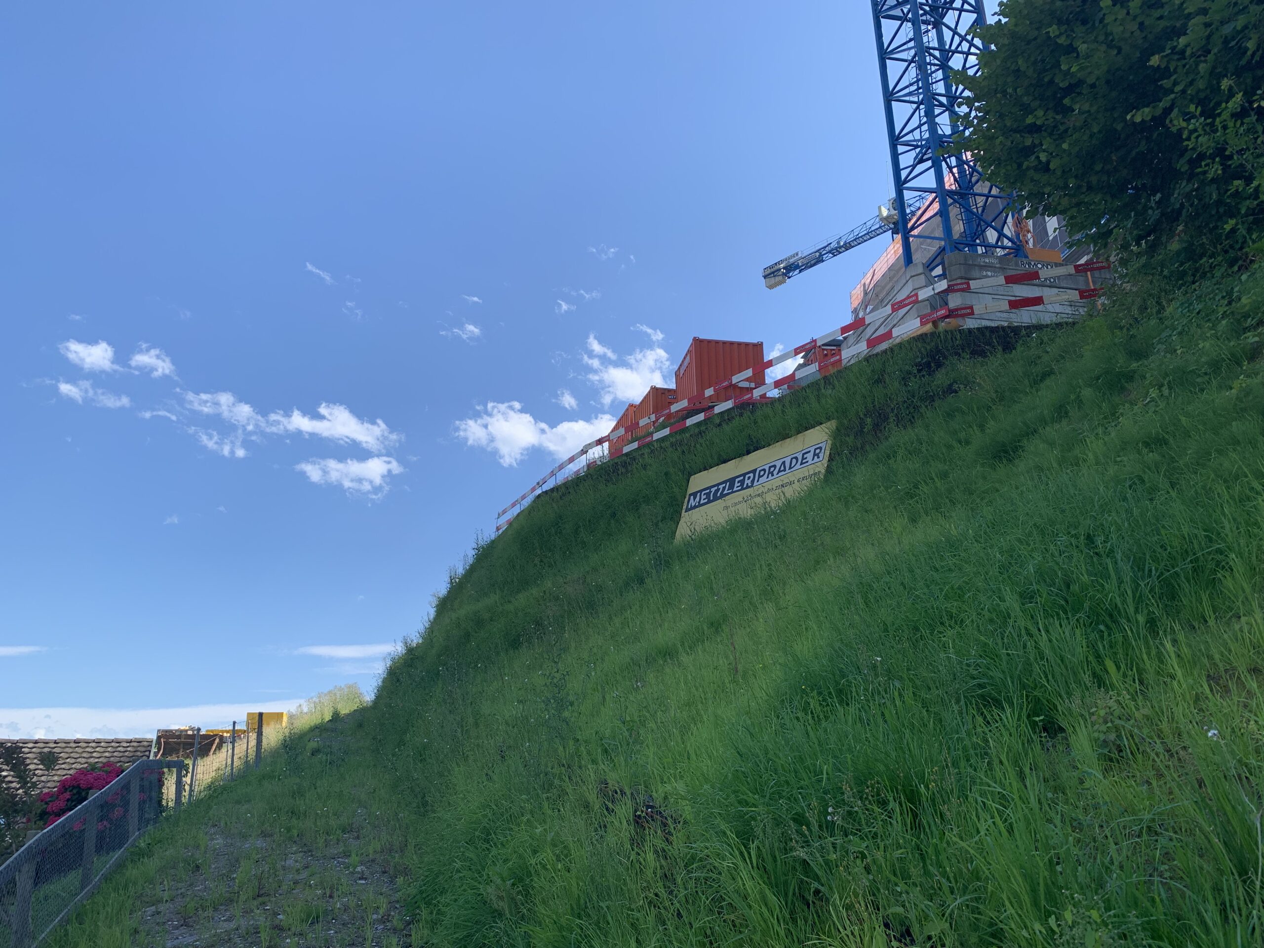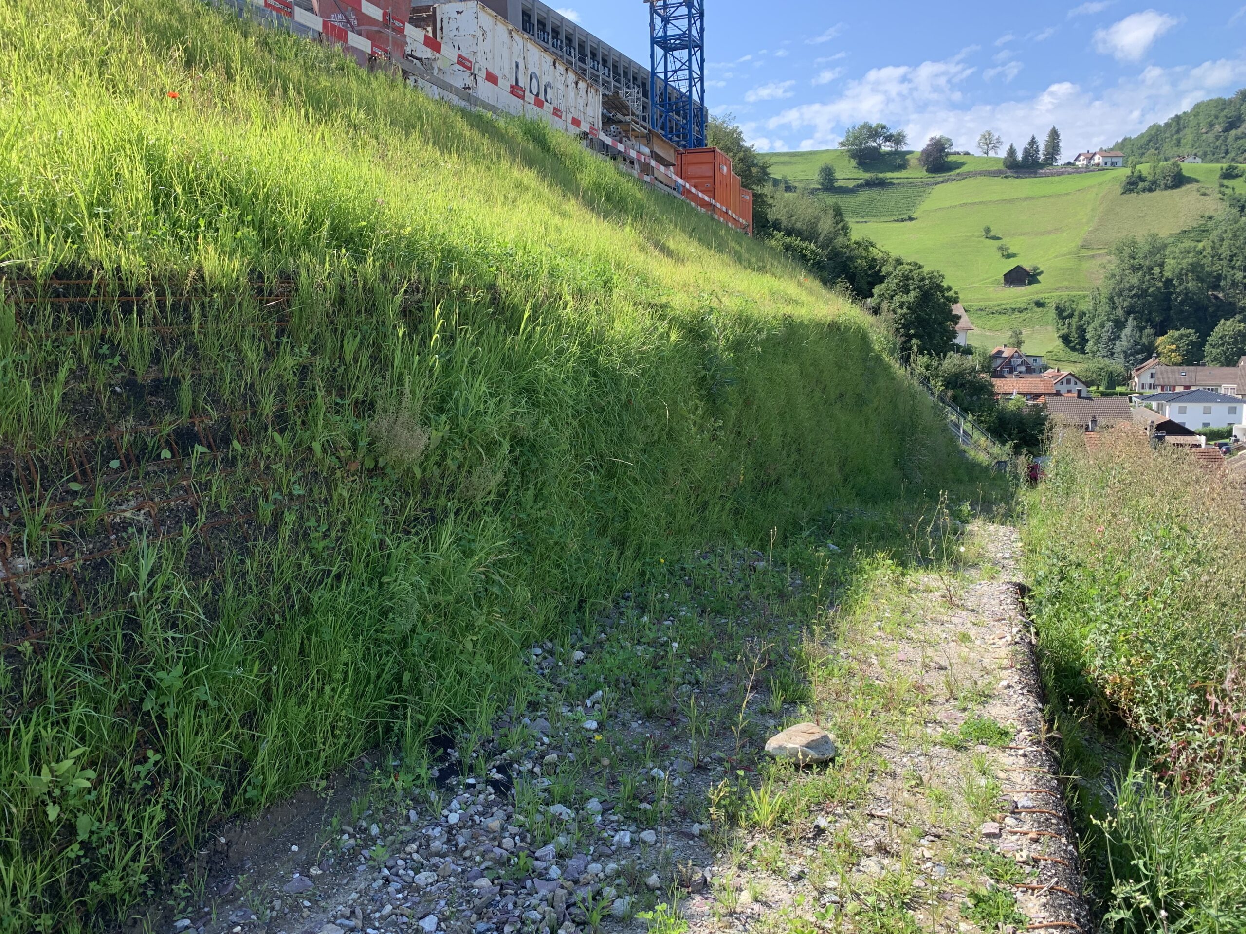 Der Gestaltungsplan zur Umnutzung der Industriebrache Textilfabrik Stoffel in Mels umfasst auch eine umfangreiche Hangsicherungsmassnahme. Mit einer Kunststoff-Bewehrten Erdkonstruktion (KBE) konnte zusätzliche Fläche für Neubauten geschaffen werden. Dazu wurden in einer ersten Phase die talseitigen 70 Grad steilen Böschungen mit dem begrünbaren Fortrac® Systems erstellt. In der zweiten Phase wurde auf die bereits erstellten Steilböschungen eine weitere Aufschüttung bis unterkant Bodenplatte hochgezogen. Die talseitigen Böschungen mit etwa 40 Grad sind jedoch zu steil, um die Stabilität nachzuweisen. Entsprechend musste auch diese Schüttung mit Geogittern bewehrt werden.