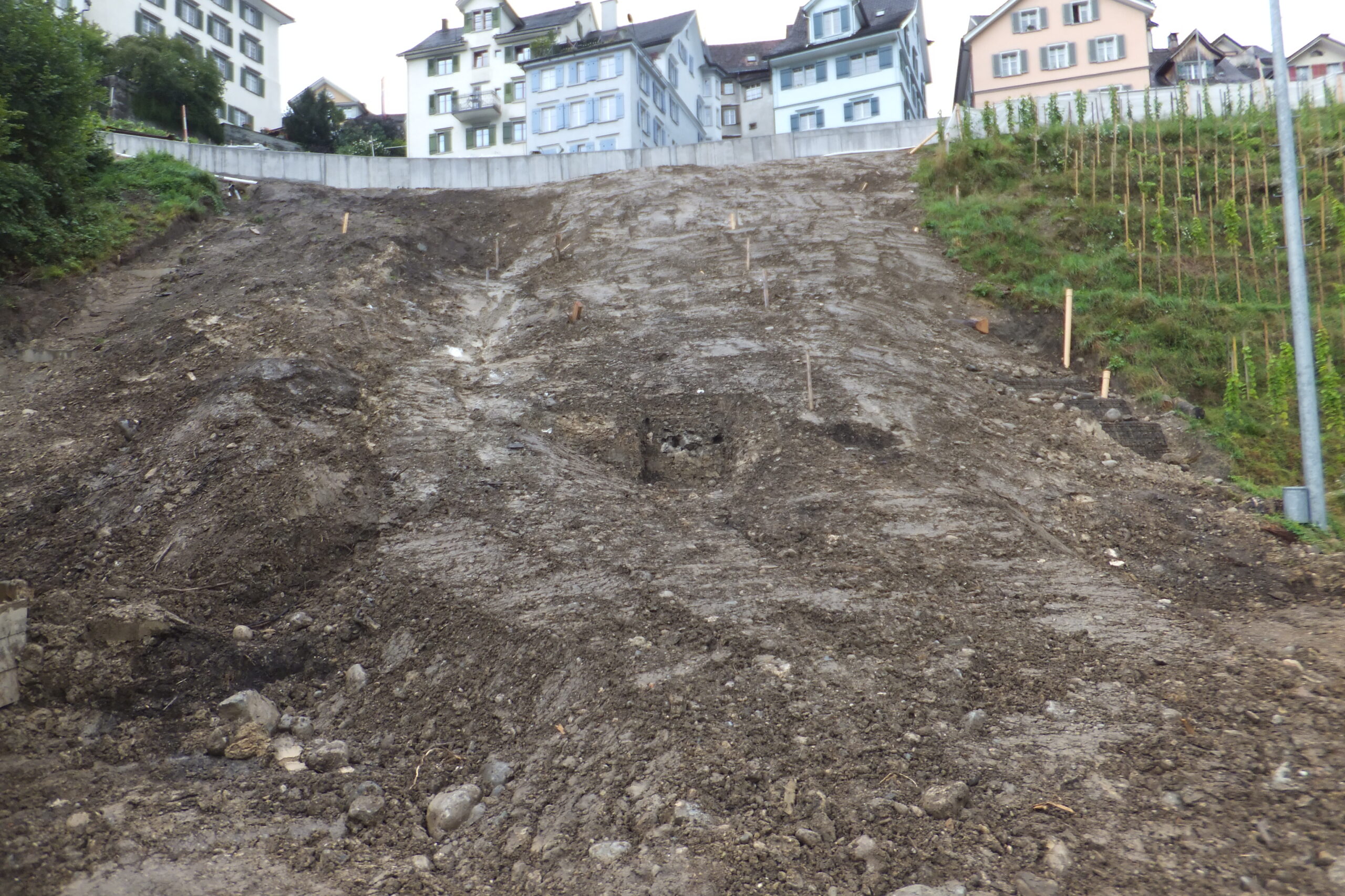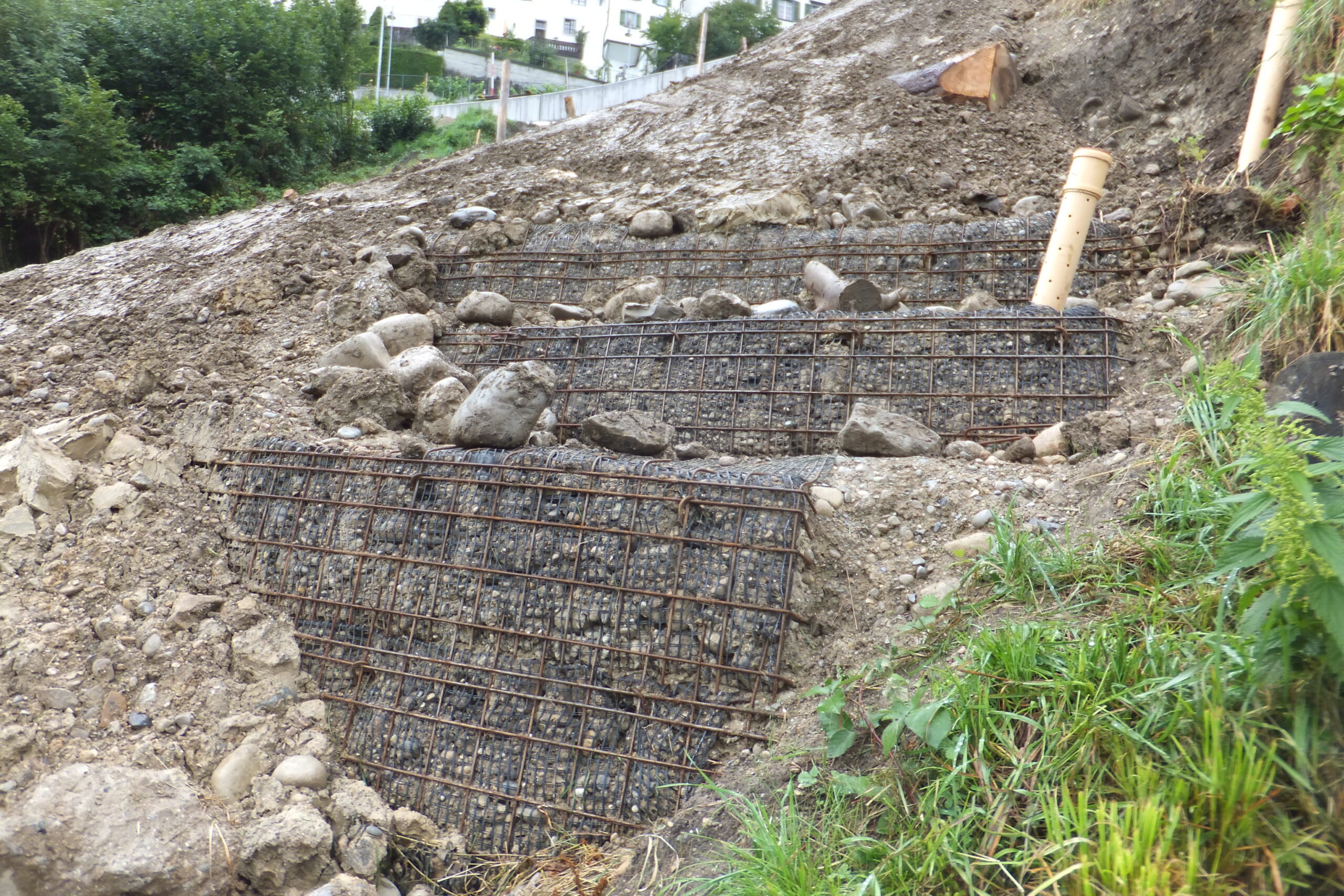 Zur Hangrutschsanierung wurden terrassenförmig angelegte und rückarmierte Stützgitter eingesetzt, die mit Humus anschliessend überdeckt wurden. Die neu angelegte Böschung wurde wieder mit Reben bepflantzt.