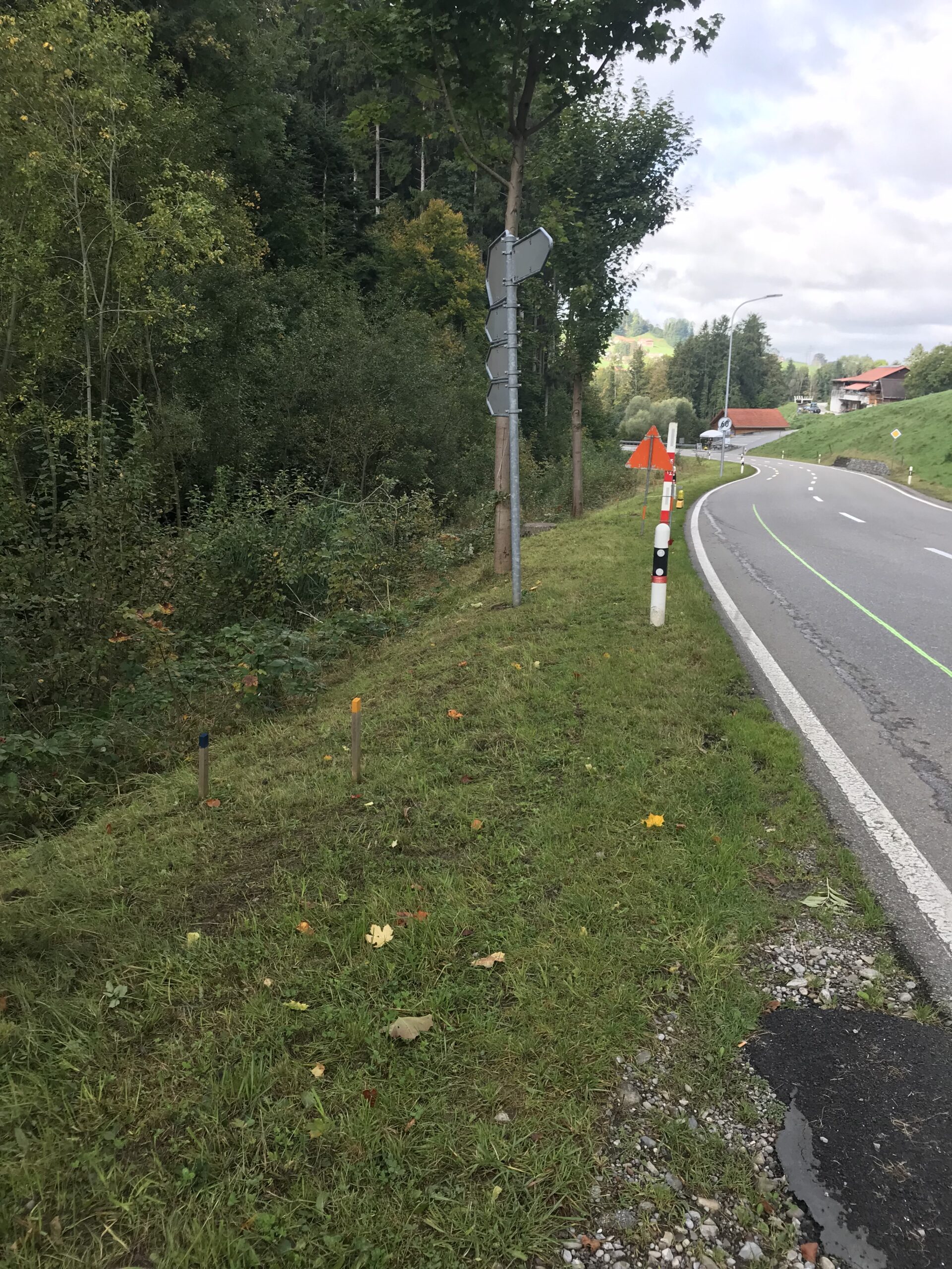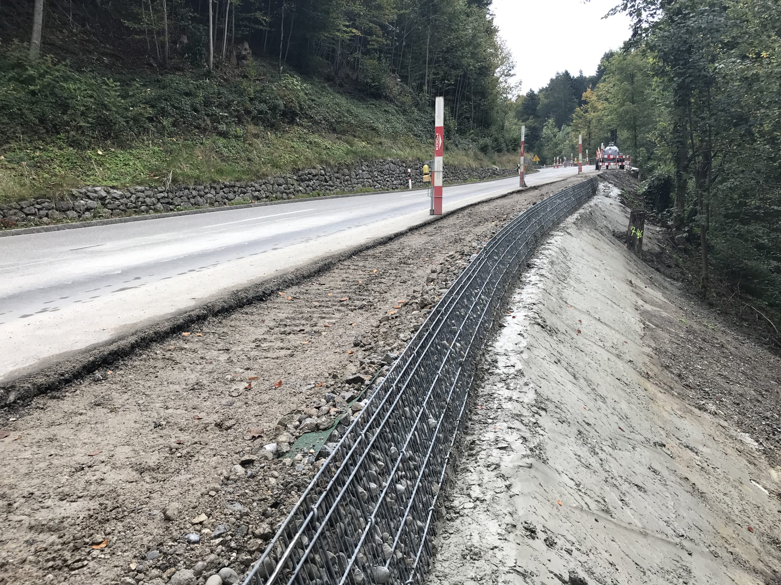 Bei einer Strassenverbreiterung wurde das anstehende Strassenbankett mit Rüglei-Gittern gesichert. Die Front wurde mit Schotter geschüttet.