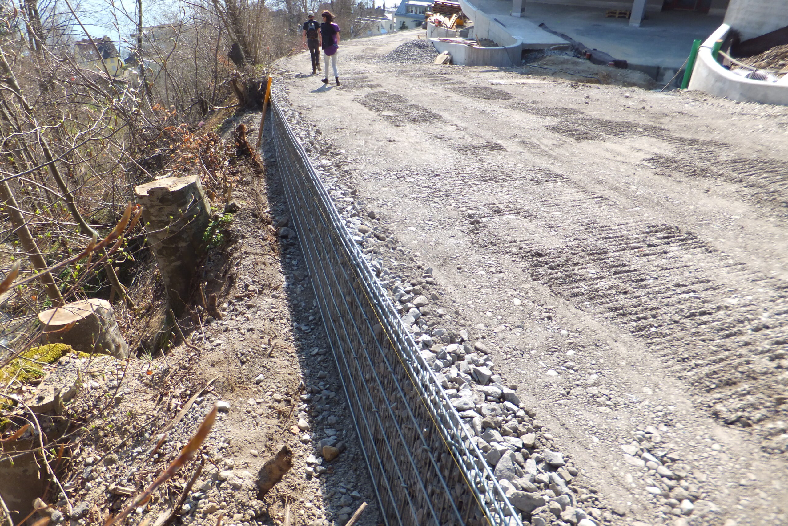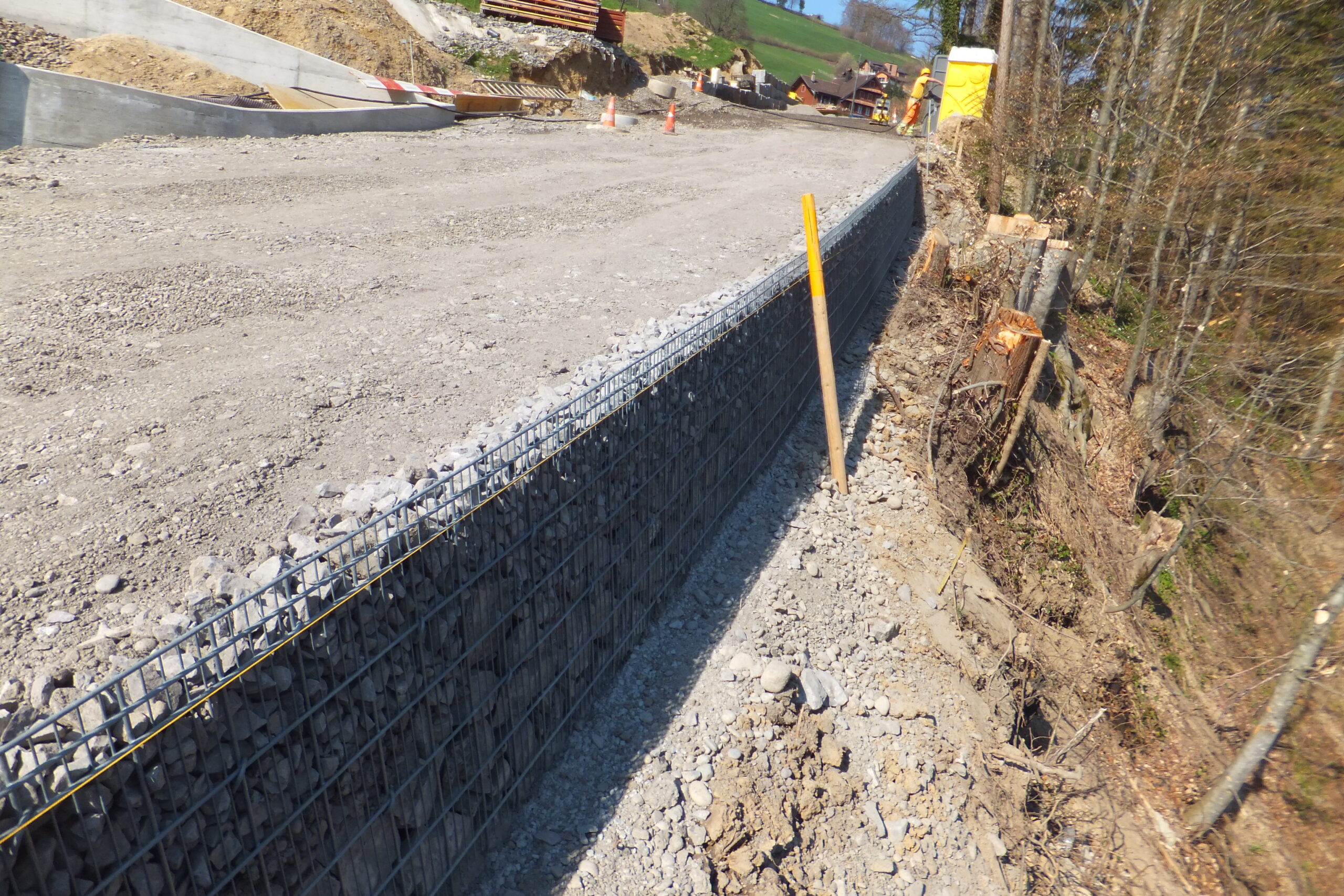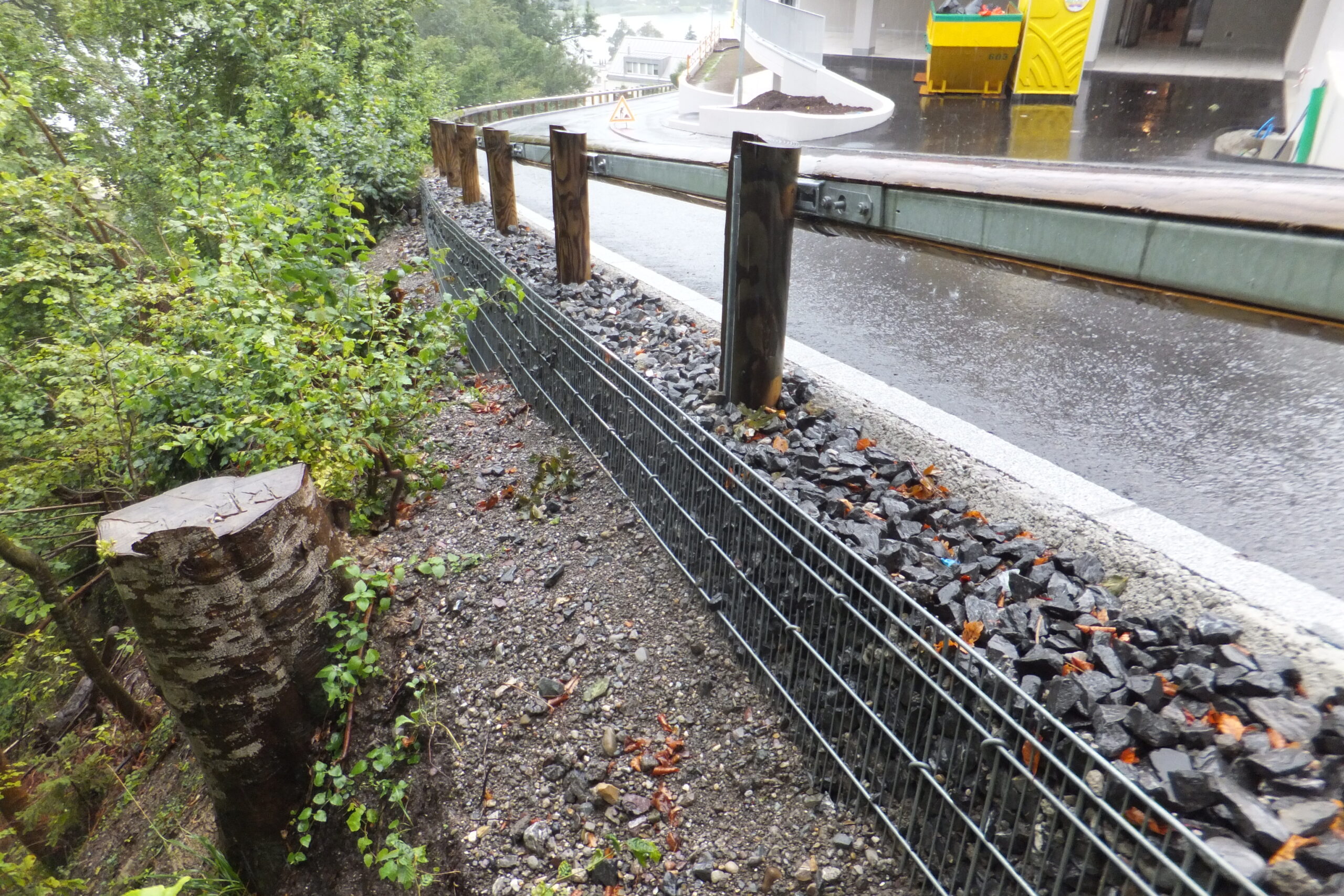 Mit Rüglei-Bankettgittern wird der Strassenrand hangseitig gestützt. Die Schotterfüllung sorgt für einen ungehinderten Wasserabfluss und ist unterhaltsfrei. Die Pfosten für die Absturzsicherung wurden nach Fertigstellung durch die Gitter gerammt.