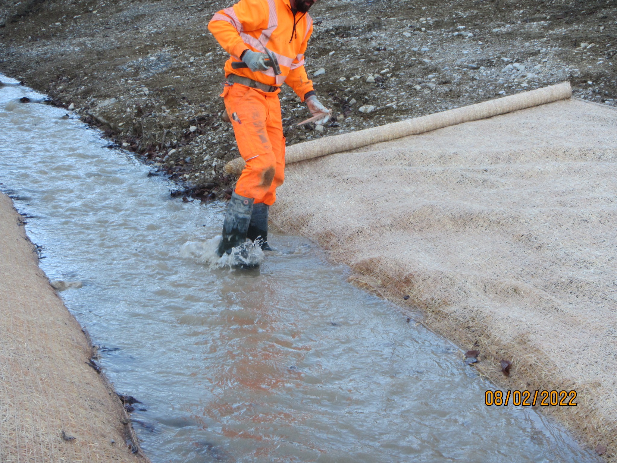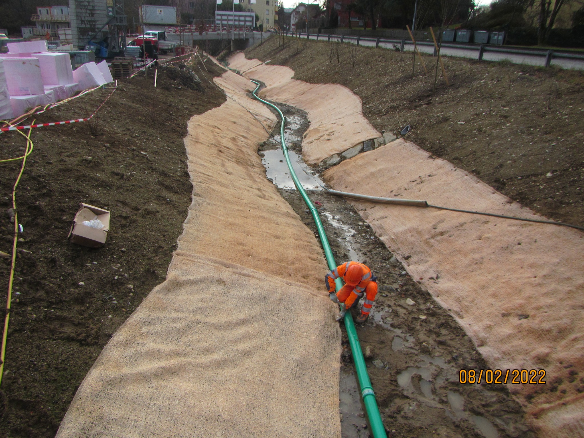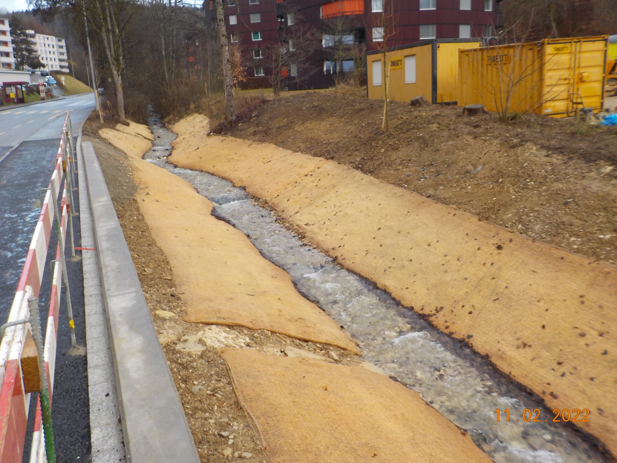 Im Zuge der Hochwasserschutzmassnahmen im Kanton Schaffhausen wurden am Hemmentalerbach Howolis-Erosionsschutzvliese vom Typ 10 HBO verlegt. Die einzigartige Struktur der Schweizer Holzwolle schafft einen guten Oberflächenabfluss, die Gefahr einer Unterspülung wird gemindert und der Schutz des Saatgutes gewährleistet. Die einmalige Rezeptur der Schweizer Holzwollevliese fördert ein schnelles Wachstum der Vegetation.